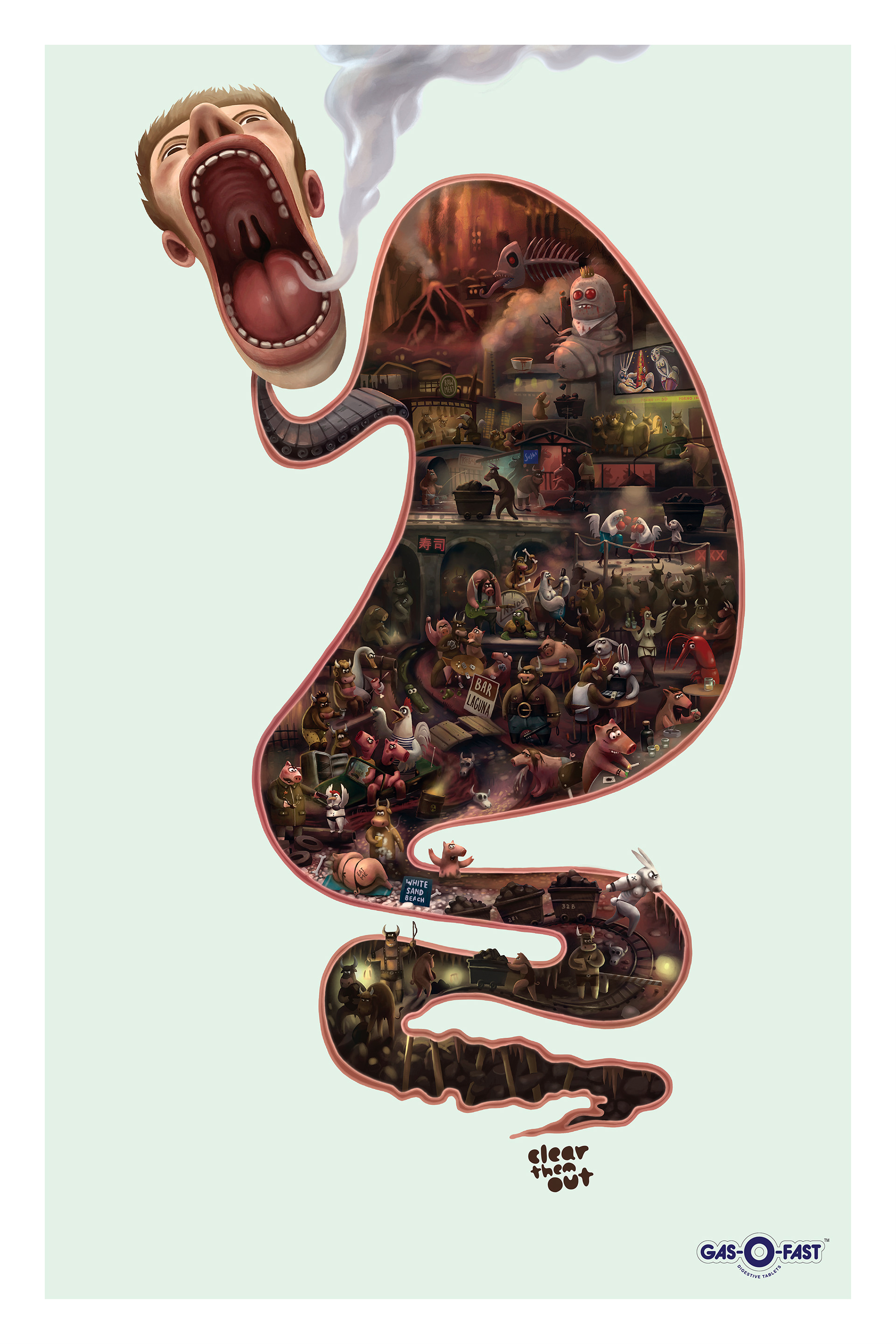 The insight: All of us have been felt this way after a heavy meal - we feel uncomfortably stuffed, as if each animal we've eaten has gone and settled down in various parts of our stomach. The creative: Taking from this insight, we built our creative. We see a settlement of animals in the digestive tract and how they've made a mess of the system. They've taken over every inch and made it almost unbearable! We see the mouth open in agony, as if screaming out for a savior. In a situation like this, for instant relief, there's only one solution - Gasofast!